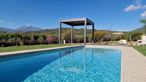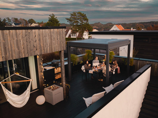 Na PERGOLUX criamos uma pérgola com telhado de persianas com lâminas que podem abrir e fechar. Adicionamos um sistema de drenagem de água para mantê-lo seco. E concebemos todos os acessórios necessários para que possa desfrutar da sua pérgola, independentemente das condições meteorológicas.