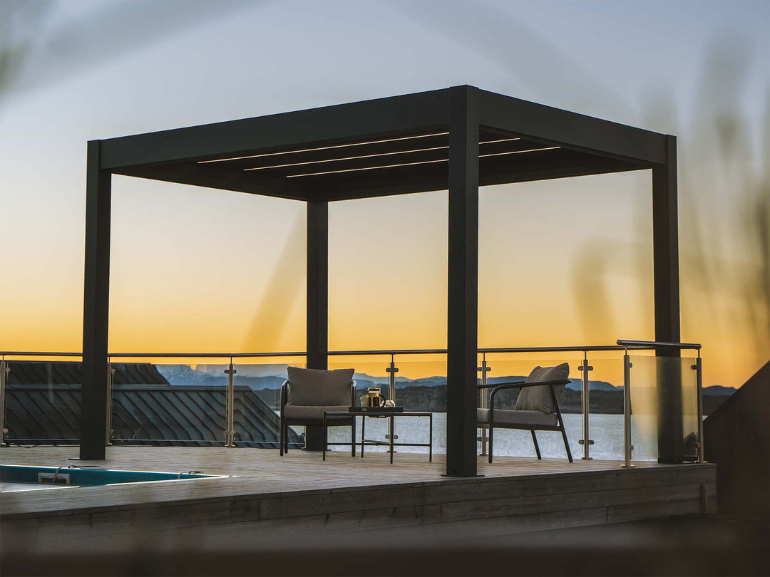 A pérgola é construída com mais de 10 anos de experiência com pérgolas nas condições climáticas da Noruega. O resultado é uma construção sólida com uma combinação perfeita de conforto e luxo.